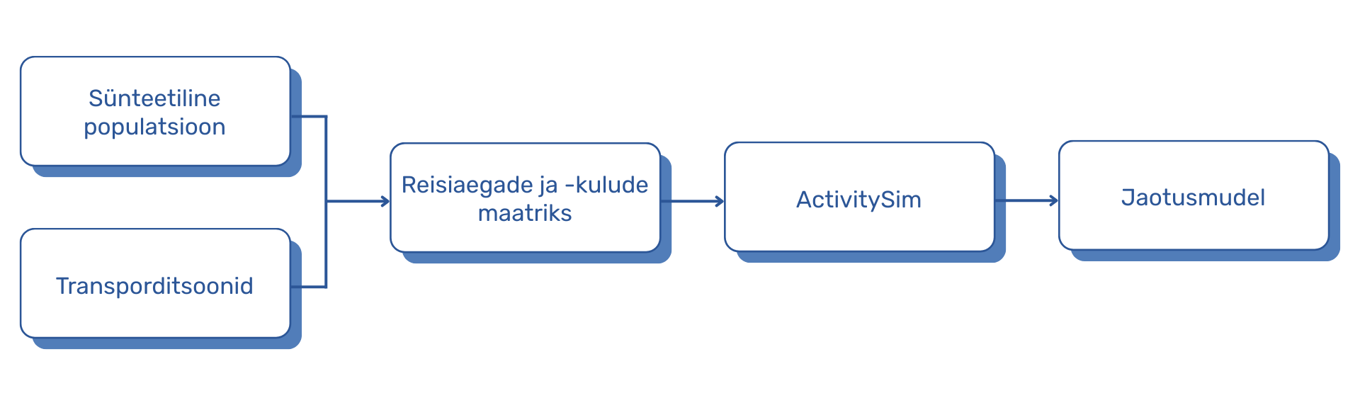 Sünteetilise rahvastiku ja tsoneeringu loomisele järgneb reisiaegade ja -kulumaatriksite arvutus, mis sisuliselt näitab, millised liikumisviisid (nt jalgsi, rattaga, autoga, ühistranspordiga) on eri tsoonide vahel võimalikud, kui palju need aega võtavad ning kui kulukad (rahaliselt) need on. See on sisendiks tegevuspõhisele avatud lähtekoodiga liikuvusnõudluse modelleerimise tarkvarale ActivitySim. Selmet modelleerida lihtsaid sõitude arve piirkondade vahel, modelleerib ActivitySim iga indiviidi (agendi) valikuid järjestikuse, samm-sammult toimuva otsustusprotsessina. Täpset reisiotsuste tegemise konfiguratsiooni ja mudelite järjestust saab vastavalt mudeldatavale stsenaariumile kohandada. Mudeli väljundiks on agentide liikumisvood transporditsoonide vahel liikumisviiside kaupa.